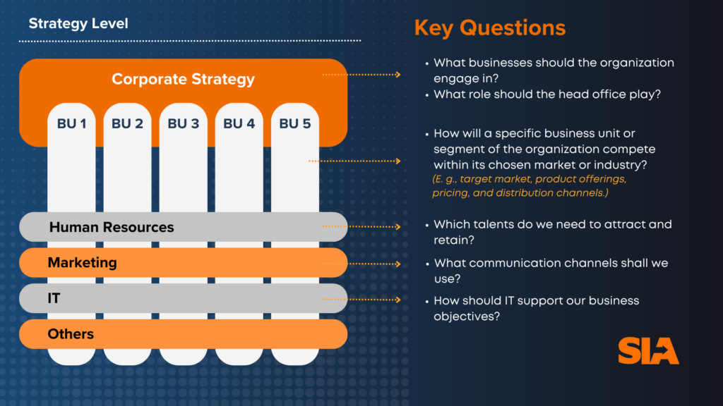 Quando si discute di strategia, è importante riconoscere l’esistenza di almeno tre livelli distinti: strategia aziendale, strategia di business e strategia funzionale. A livello aziendale, la strategia ruota attorno a due domande fondamentali: a quali business dovrebbe dedicarsi l’organizzazione? E quale ruolo dovrebbe svolgere la sede centrale?