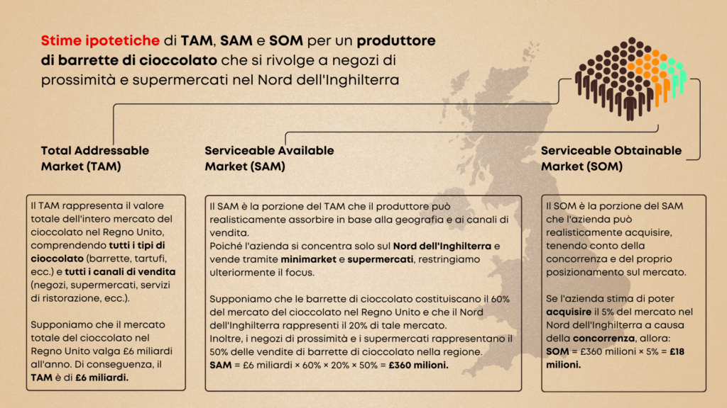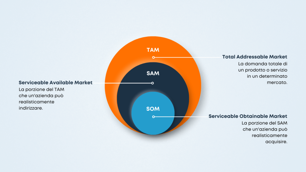 Vedi l’infografica qui sotto per un esempio illustrativo che stima TAM, SAM e SOM.