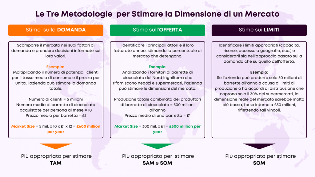- Approccio basato sui vincoli: combina le intuizioni della domanda e dell’offerta, ma tiene conto anche delle limitazioni del mondo reale, come la capacità produttiva complessiva, le capacità di distribuzione o le restrizioni normative, fornendo una stima più concreta della dimensione del mercato.
