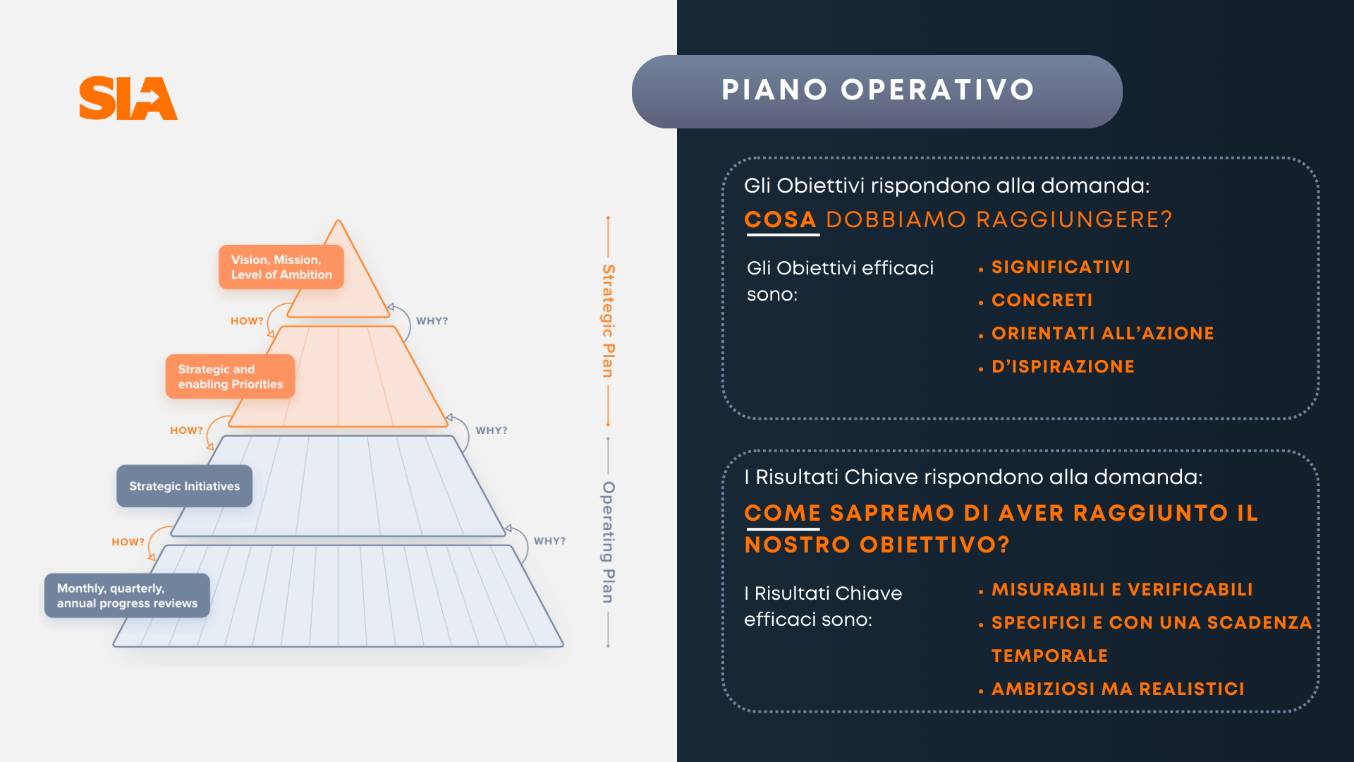 - I Risultati Chiave sono invece metriche quantitative che misurano e monitorano COME raggiungere l’obiettivo. I Risultati Chiave dovrebbero essere facili da misurare frequentemente, specifici e con una scadenza temporale, ambiziosi ma realistici. In altre parole, dovrebbero essere abbastanza ambiziosi da spingere il tuo team a mirare all’eccellenza, ma sufficientemente realistici da essere raggiungibili.