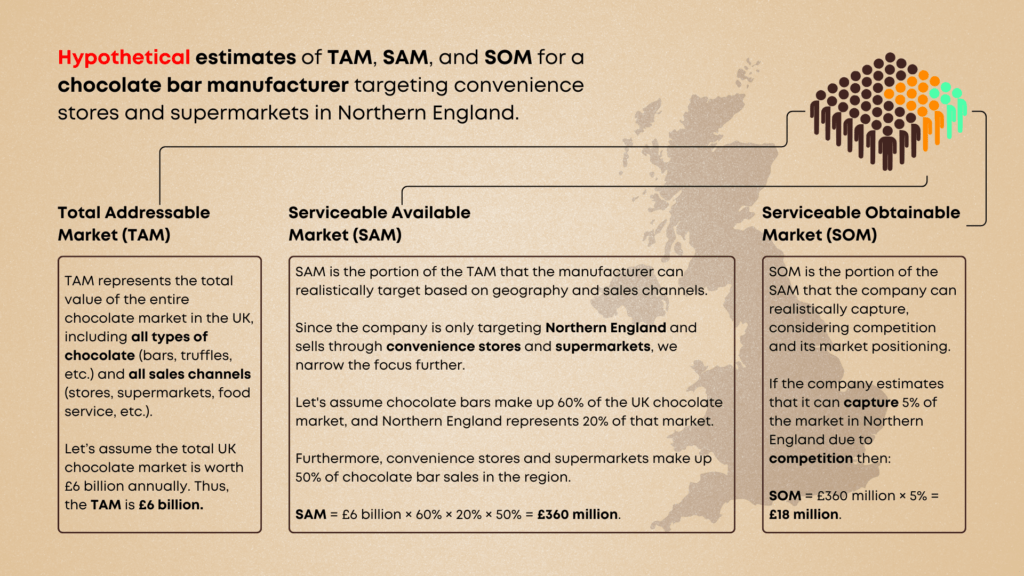 In this scenario, TAM assumes that the company could, in theory, address the entire UK chocolate market, which provides a top-level view of the market’s overall size.