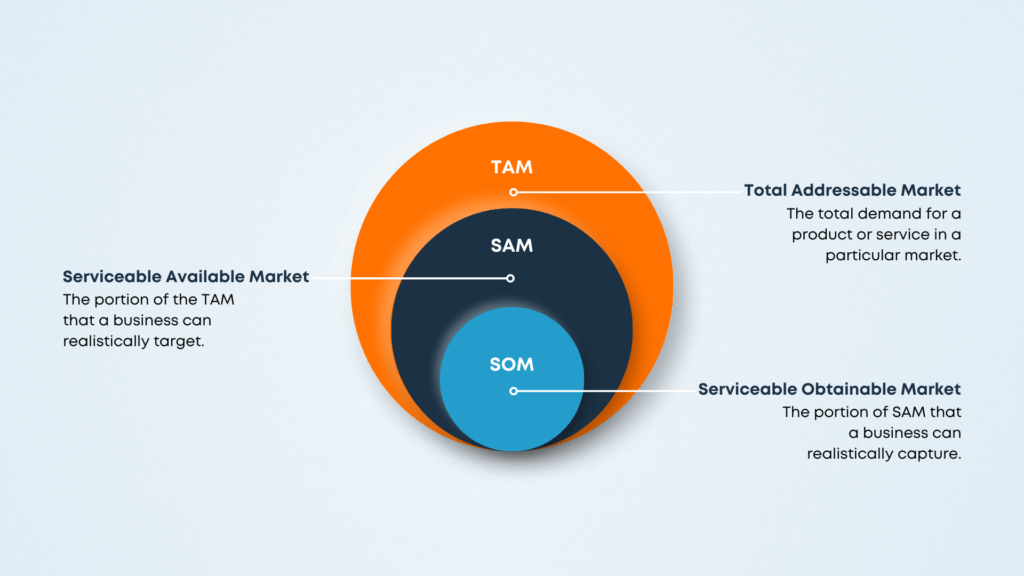 The three key metrics used in market size analysis are: Total Addressable Market (TAM), Serviceable Available Market (SAM), and Serviceable Obtainable Market (SOM). Let’s explore how each metric contributes to a more nuanced perspective on your market potential and refines your strategic approach.