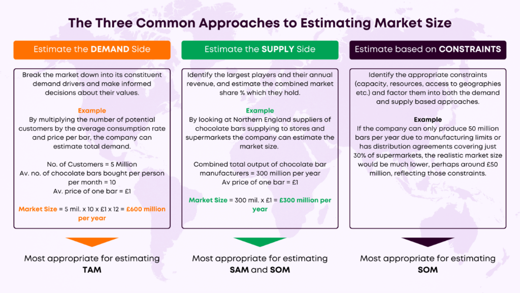 Demand-side approach: This estimates market size by analysing potential customer demand using “drivers” such as the number of customers, the frequency of purchase, the average number of products bought and the prices. This approach tends to estimate the “upper side of the market size” ie it tends to overestimate.