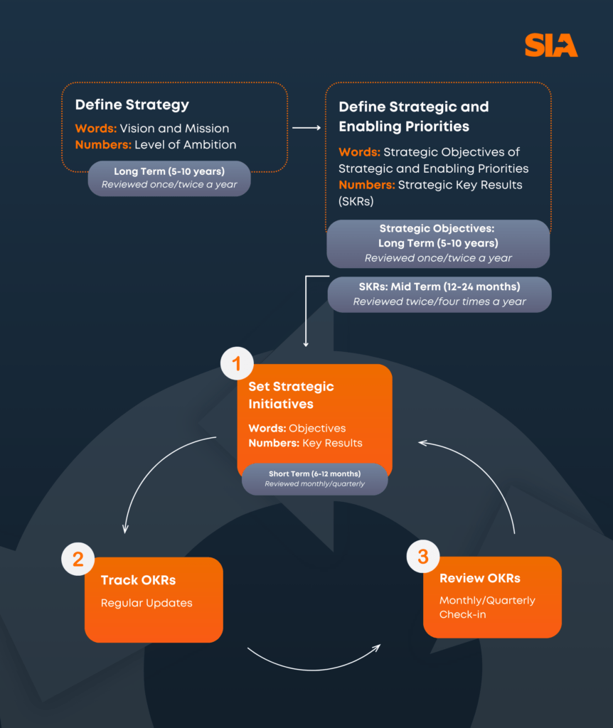 OKRs at different levels must be set with progressively shorter time horizons: while it is appropriate to have a time horizon of 5-10 years for Vision, Mission and Level of Ambition, Strategic Priorities should have a more mid-term time horizon, and projects and initiatives a much shorter one (less than one year). This structure provides necessary stability at Strategic level while allowing agility and flexibility to adjust tactics quickly based on real-time execution feedback signaling the need for a change in direction.